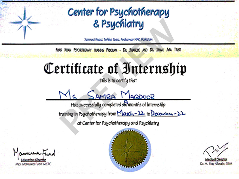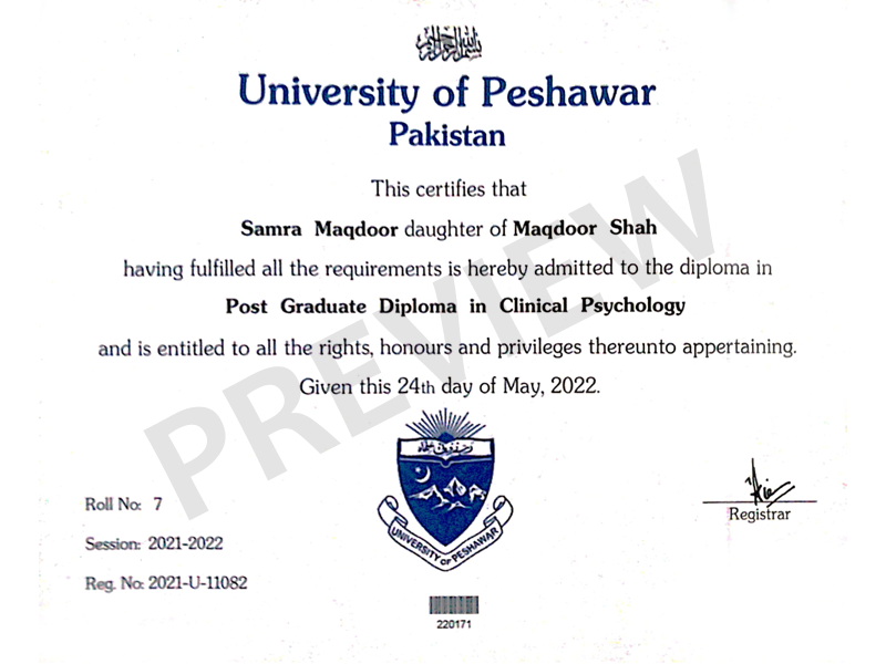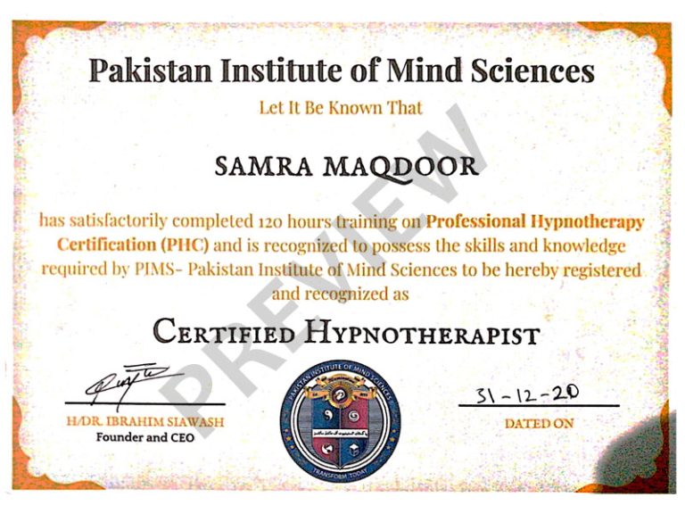 Samra Maqdoor did Masters in Psychology from Kohat University and then specialization in Clinical Psychology from Peshawar University. She is also a certified hypnotherapist by holding a hypnotherapist certificate from PIMS.
